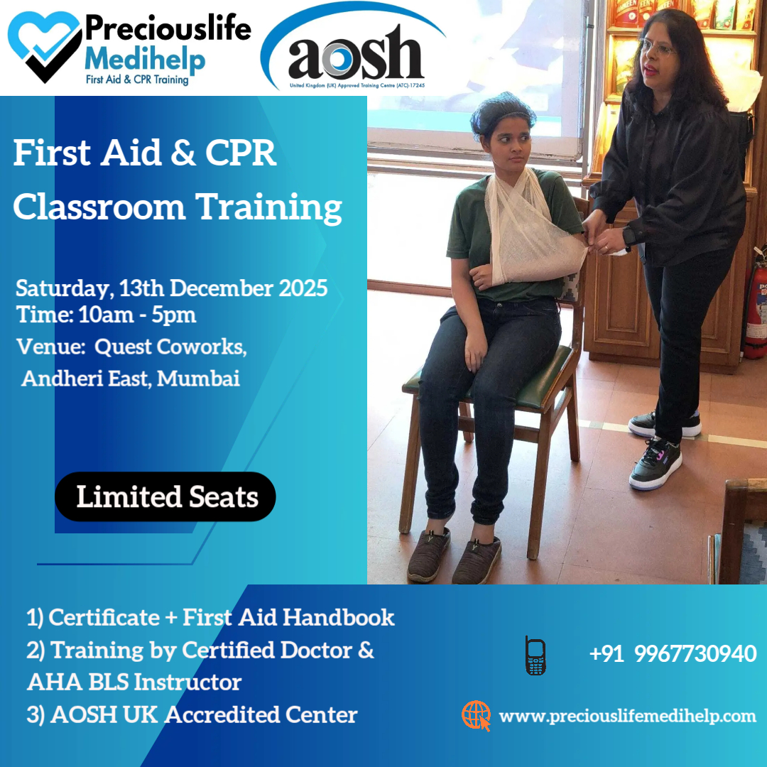 Looking to equip your corporate team with top-tier First Aid Training? Look no further than Preciouslife Medihelp, your premier destination for comprehensive First Aid and CPR Training Across India. As an Internationally Recognized Training Center Approved by AOSH United Kingdom (UK), we adhere to stringent standards, ensuring you receive the highest caliber of instruction available. Our track record speaks volumes: we've empowered over 27,000 participants, not only India but also 28 Countries worldwide, 230+ Clients PAN India with essential First Aid & CPR skills. Join us in prioritizing the safety and well-being of your employees, making your corporate environment a safer and more prepared space for all.